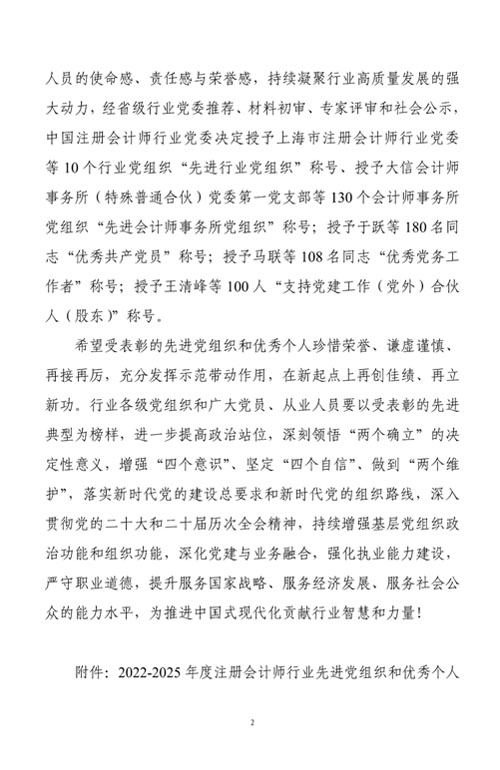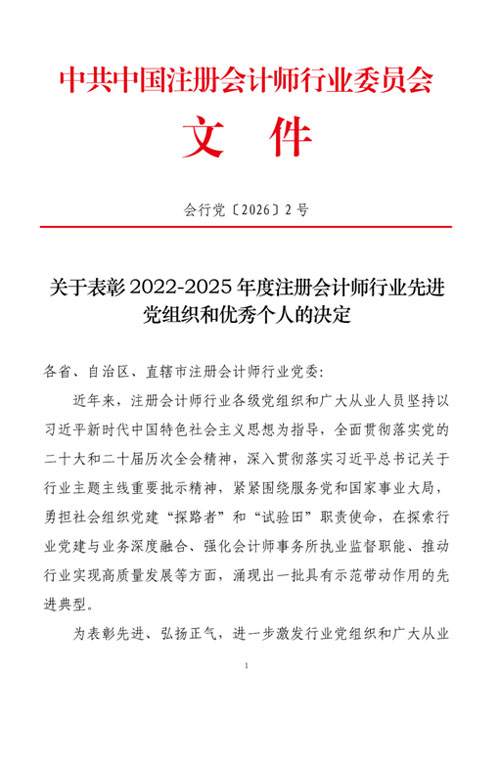 近日,收到中共中国注册会计师行业委员会文件《关于表彰2022-2025年度注册会计师行业先进党组织和优秀个人的决定》,我所主任会计师吴林海同志荣获注册会计师行业“优秀党务工作者”称号。